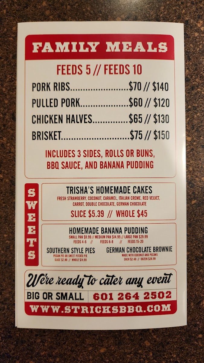 Introducing the menu at Strick's Bar-B-Q & Catering, nestled in Hattiesburg, MS, is a culinary journey not to be missed. Their offerings boast a vibrant variety of smoked meats, including tender brisket and juicy ribs, which require little to no sauce, thanks to their rich, well-balanced flavors. The standout items include the 3 Meat Platter, allowing guests to savor different proteins with perfectly seasoned sides.